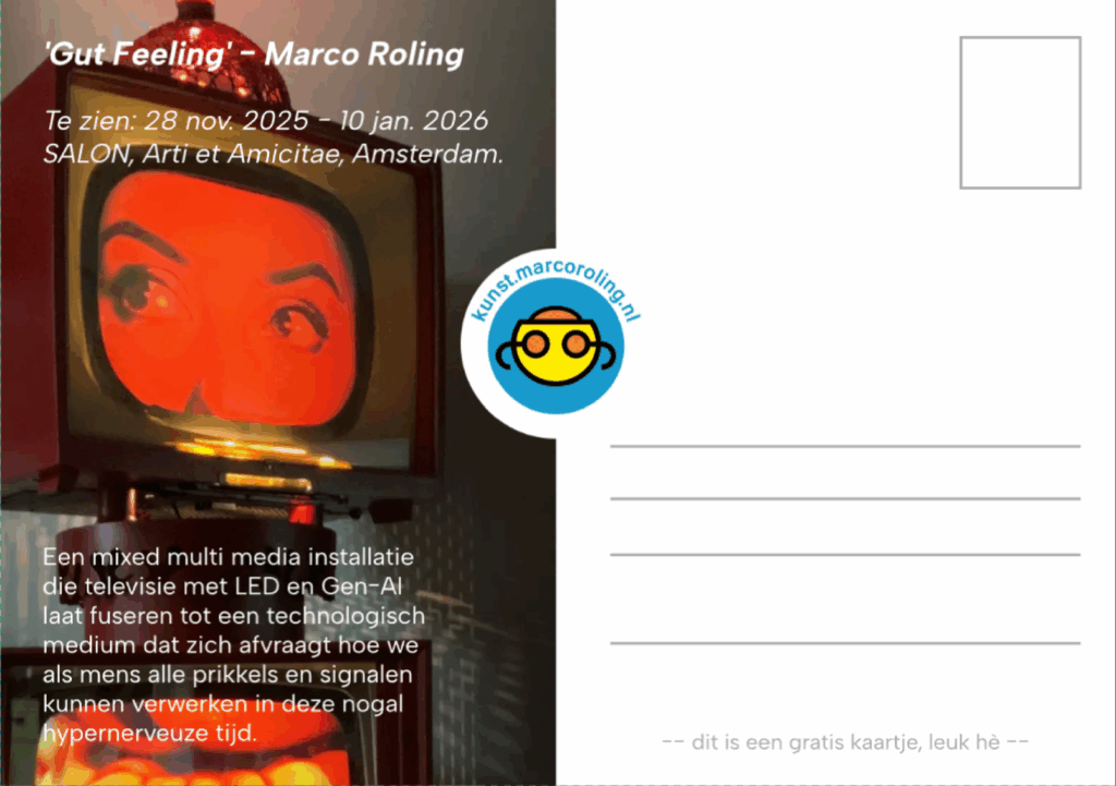 ‘Gut Feeling’ is een mixed-multimedia installatie. Verbindt oude teevees met moderne LED en Gen-AI. Een fusie van technologieën. Een medium dat zich afvraagt hoe we als mens alle prikkels en signalen kunnen verwerken in deze nogal hypernerveuze tijd. Komt er dagelijks misschien teveel bij ons binnen, en weet ons lijf daar eigenlijk niet meer zo goed mee om te gaan. Ruis, tinnitus, geborrel, gerommel, steken, tics, en wat nog meer. Wat zegt ons onderbuikgevoel daar eigenlijk van? Negeren? Rust nemen? Iets veranderen? Een lichaam is geen machine, het is veel complexer dan dat wij ooit zullen kunnen begrijpen. Denk niet alleen met je hoofd, en niet alleen met je hart, maar ook met je ‘gut’.