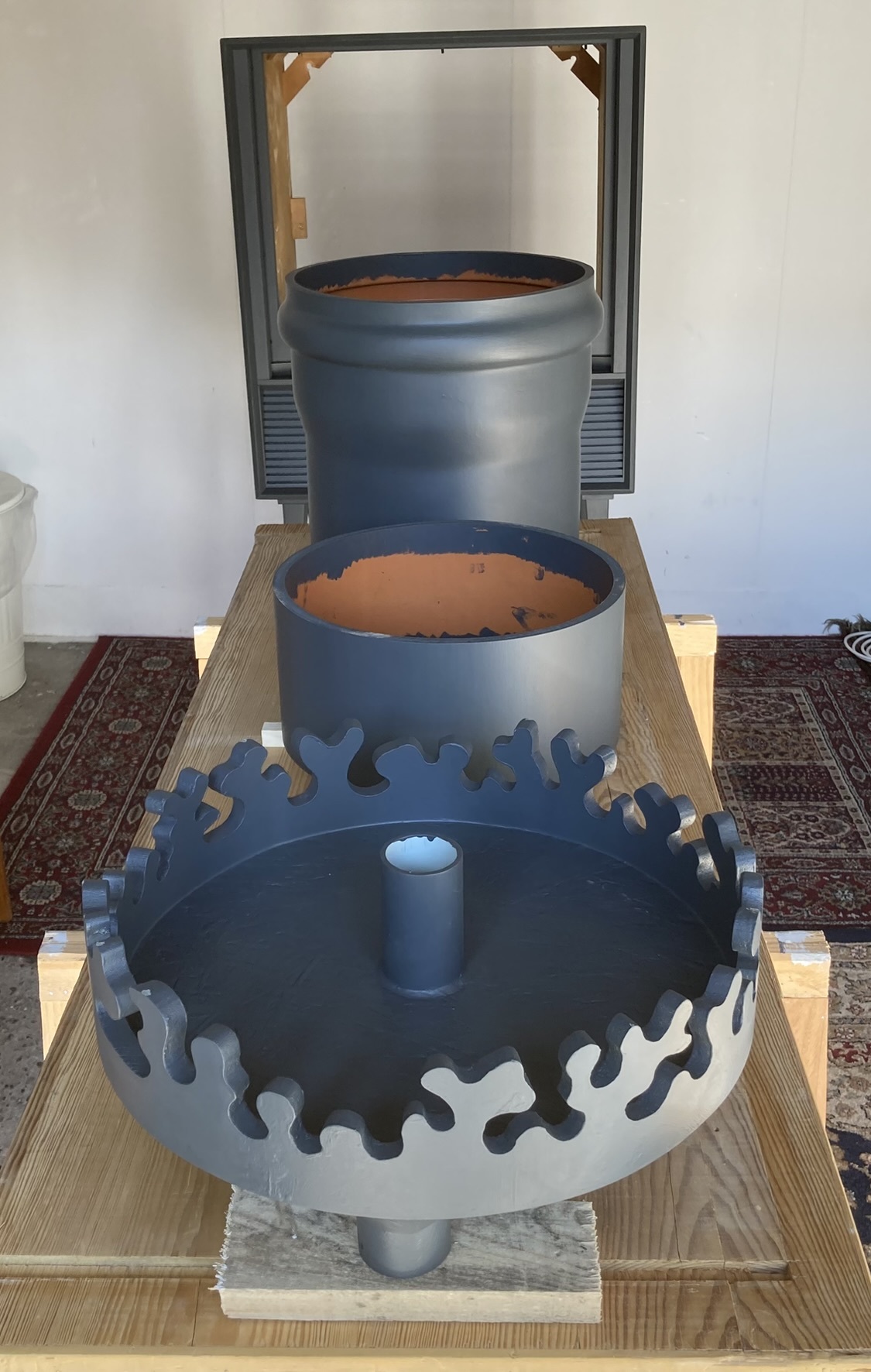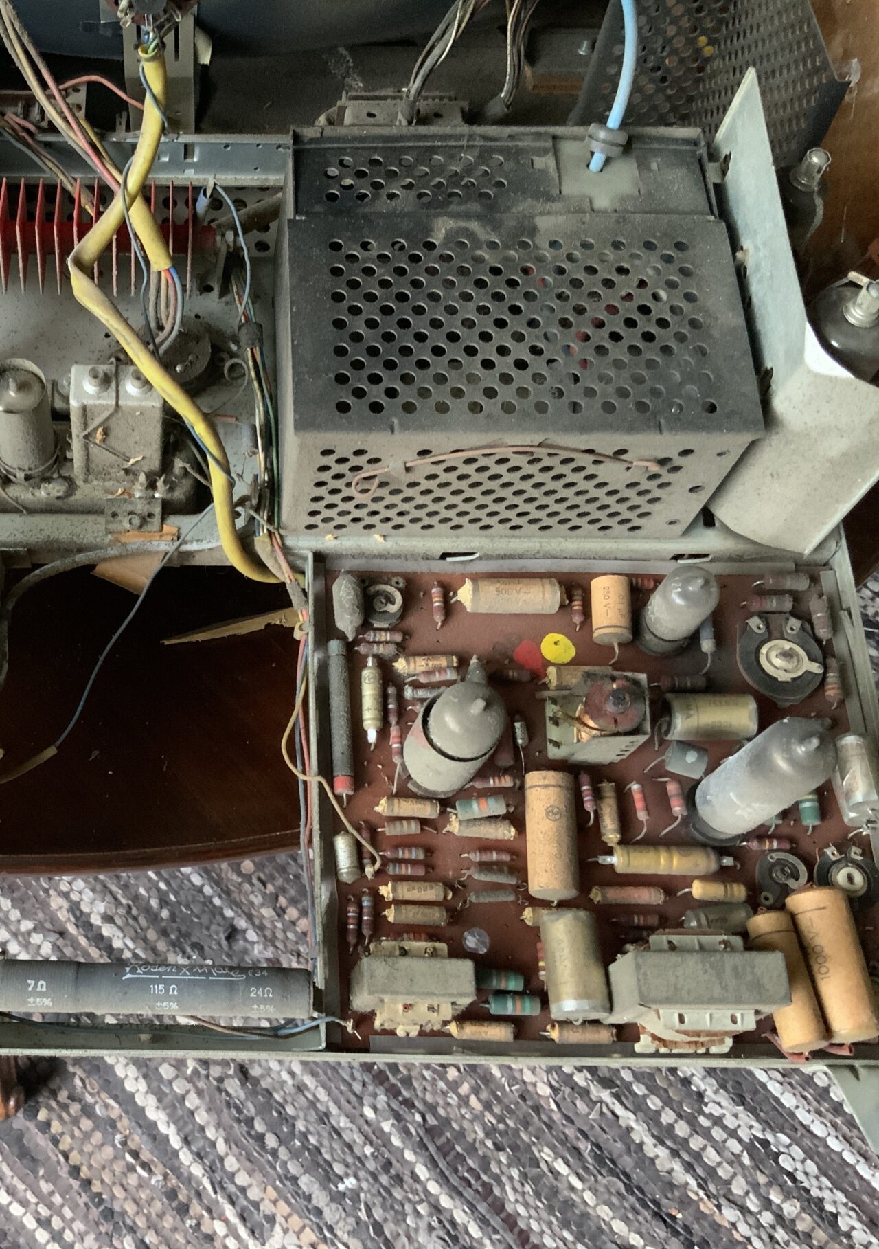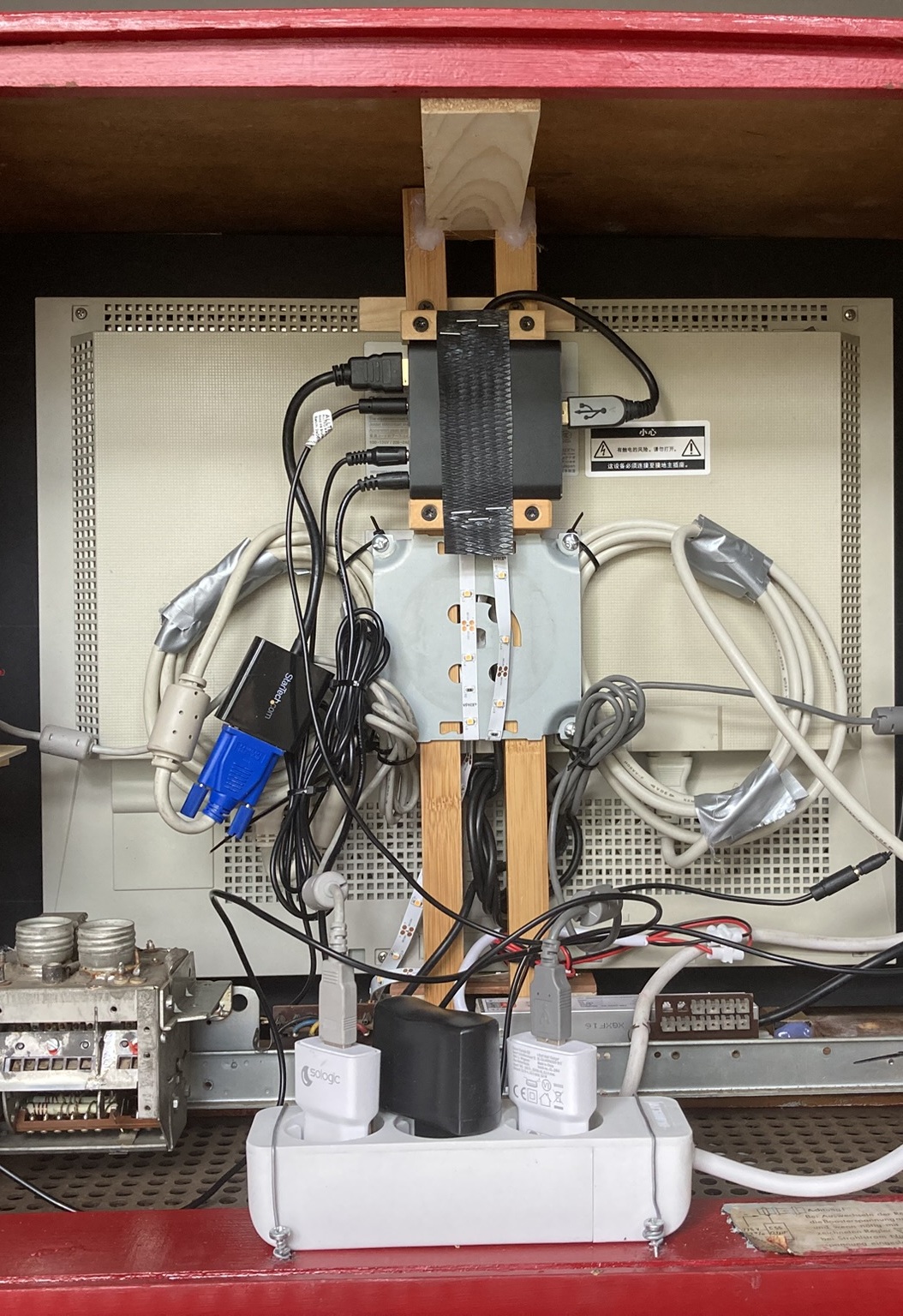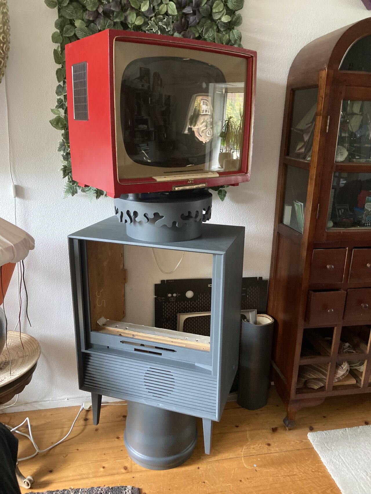 Ik vroeg Chat-GPT of je zo’n oude kathodestraalbuis kan demonteren zonder problemen. Tot mijn verbazing raadde die me af om er een klap op te geven, want het ding is vacuüm en kan imploderen. of bevat een gas dat ongezond is als het vrijkomt. Het leek een goed advies, dat ik opvolgde. De bolling van de buis, daar ging het mij om. Want zonder bollebuis geen authentieke uitstraling als ik er platte led-schermen in ging maken. Met plexiglas verwarmen en vervormen in de negatieve mal van de buisbolling (snapt u het nog?) lukte het uiteindelijk wel. Verder was het strippen van de binnenkant een makkie. Alle buizen bewaard voor een volgend kunstwerk. En verder gegaan met het bouwen van de toren met PCV rioolbuis, hout en geprinte materialen.